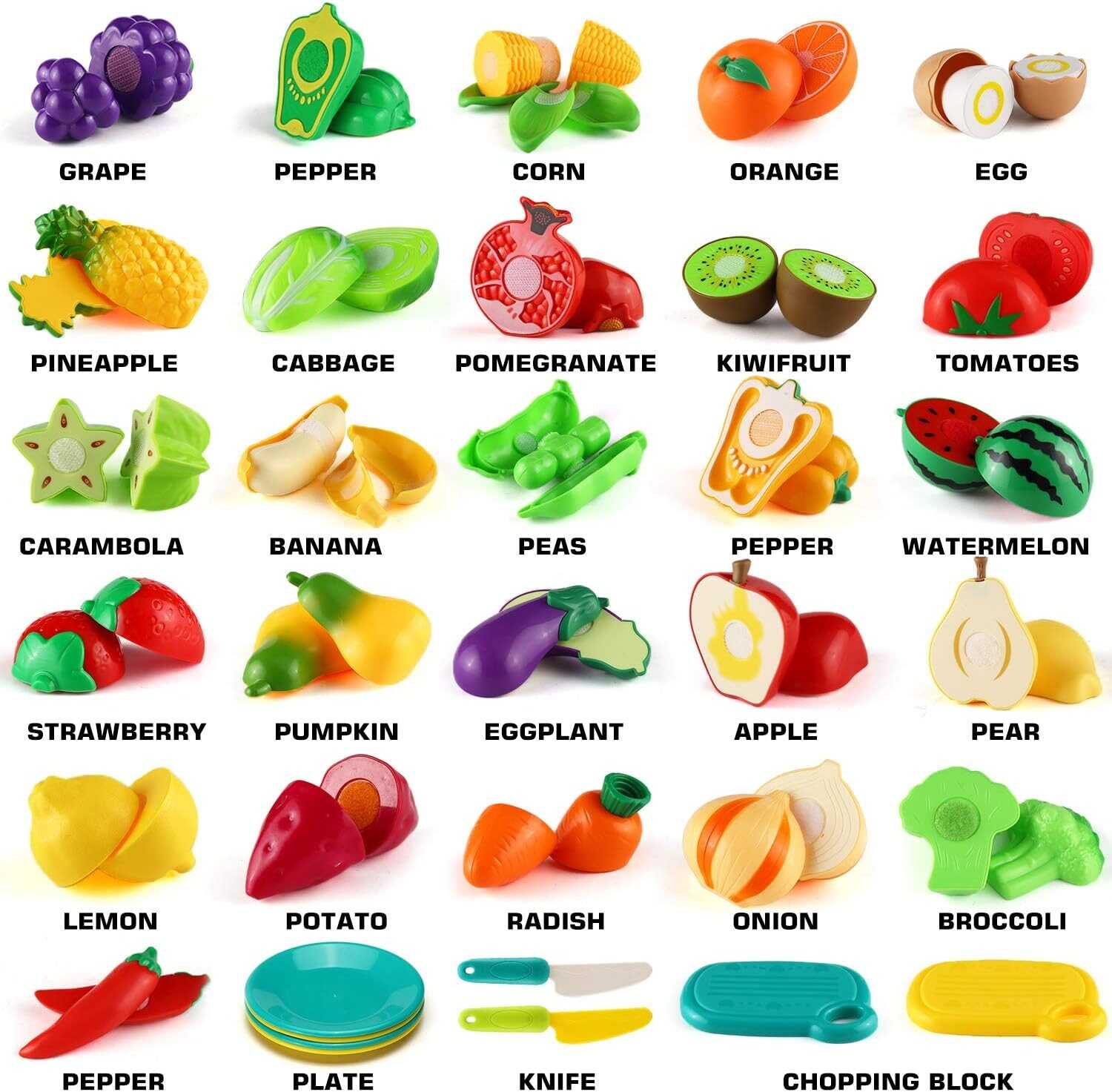 • 35 items pretend play food set for toddlers: 26 different kinds of play fruit and vegetables (can be separated into 61 small pieces), a toy grocery basket, 2 cutting boards, 2 kitchen knives, and 4 dinner plates.
