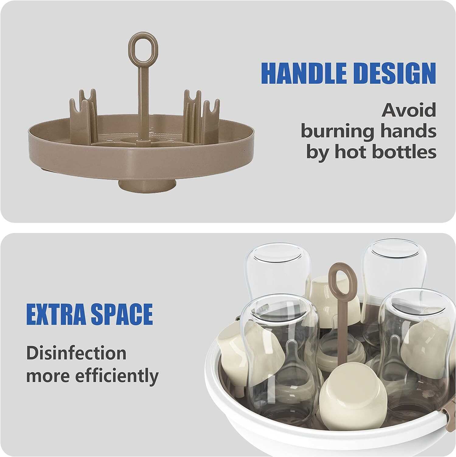 • ???? & ??????? ????????: The baby bottle sterilizer is made of pp food-grade high temperature resistant material, BPA free. Safety clips keep the lid securely closed and side grips stay cooler for safe handling