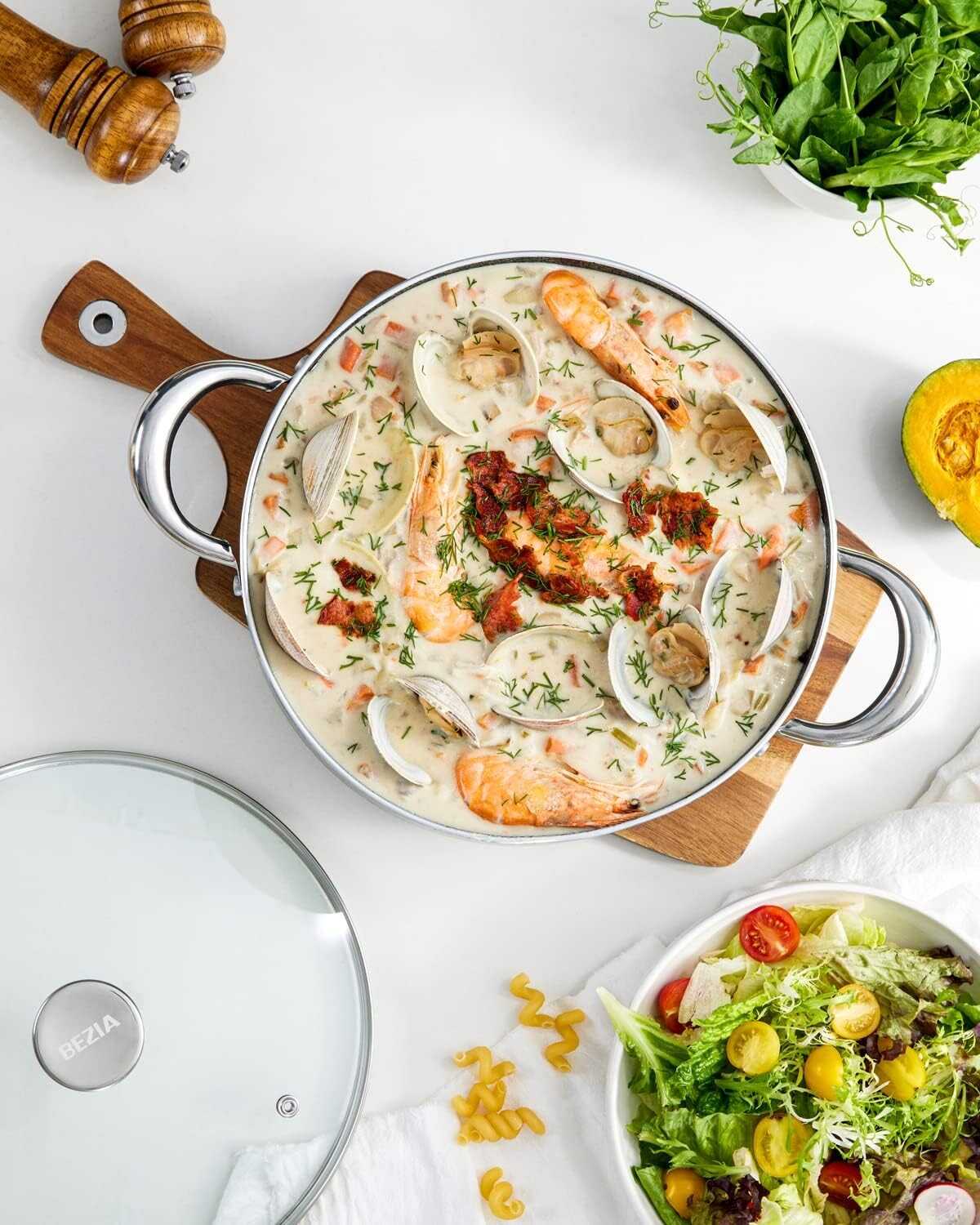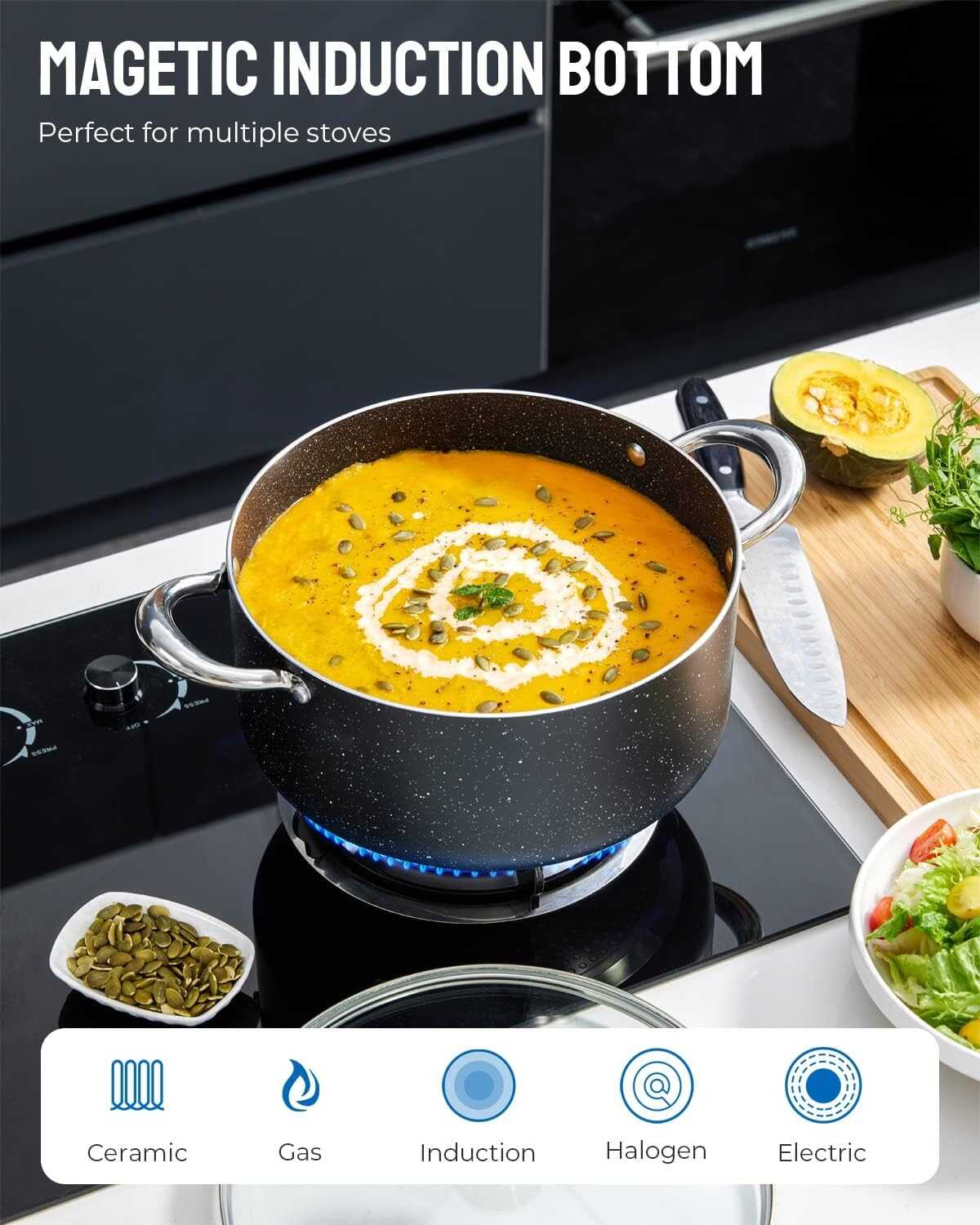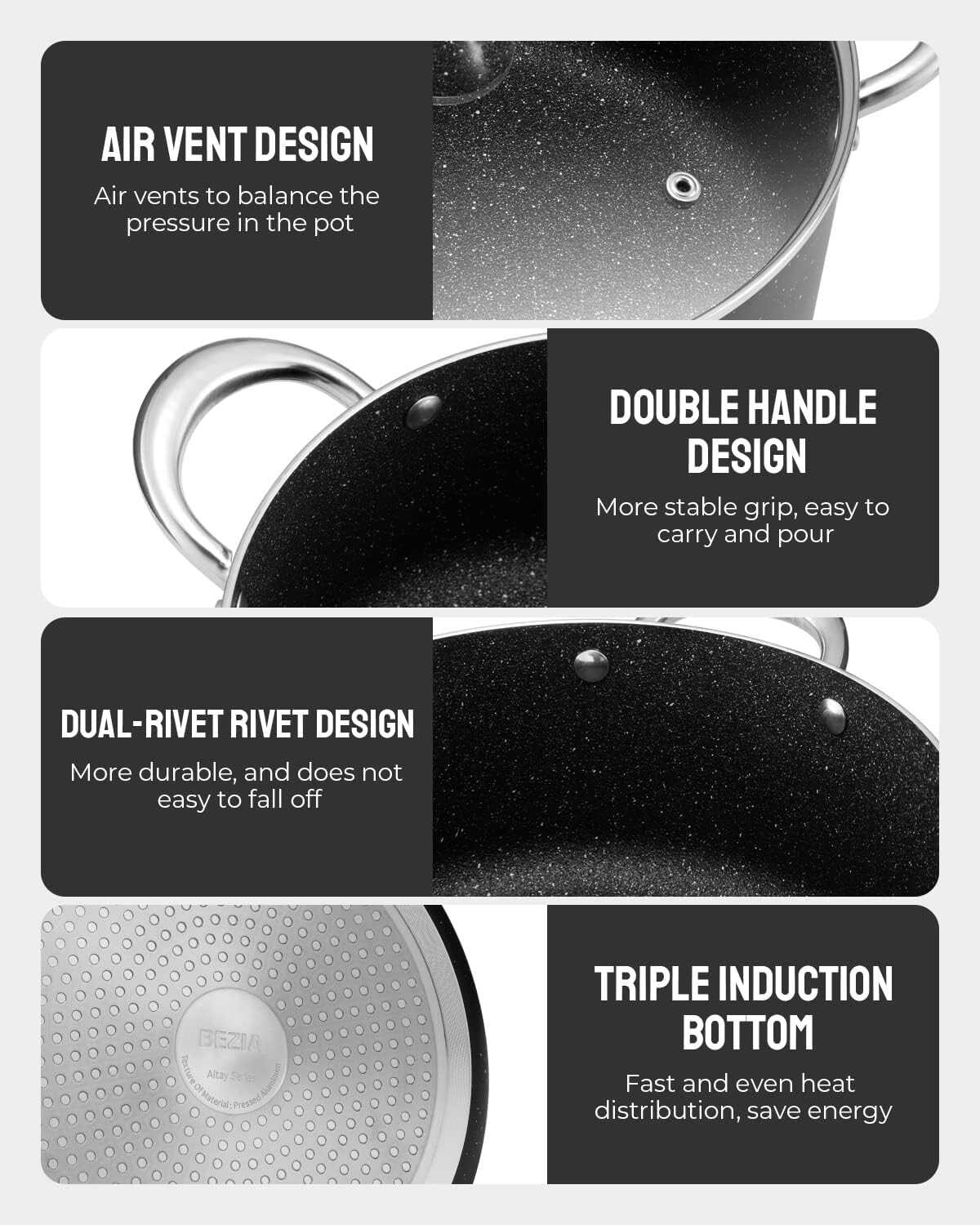 • QUICK & EVEN COOKING - The BEZIA stock pot features a triple induction-ready base and durable aluminum alloy core, which distributes heat evenly, allowing for the perfect simmer, and providing deliciously and perfectly cooked foods daily.