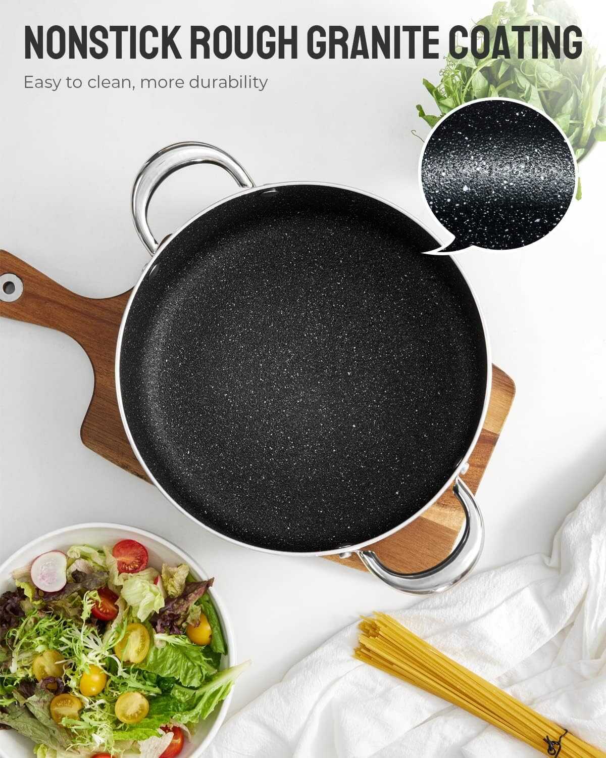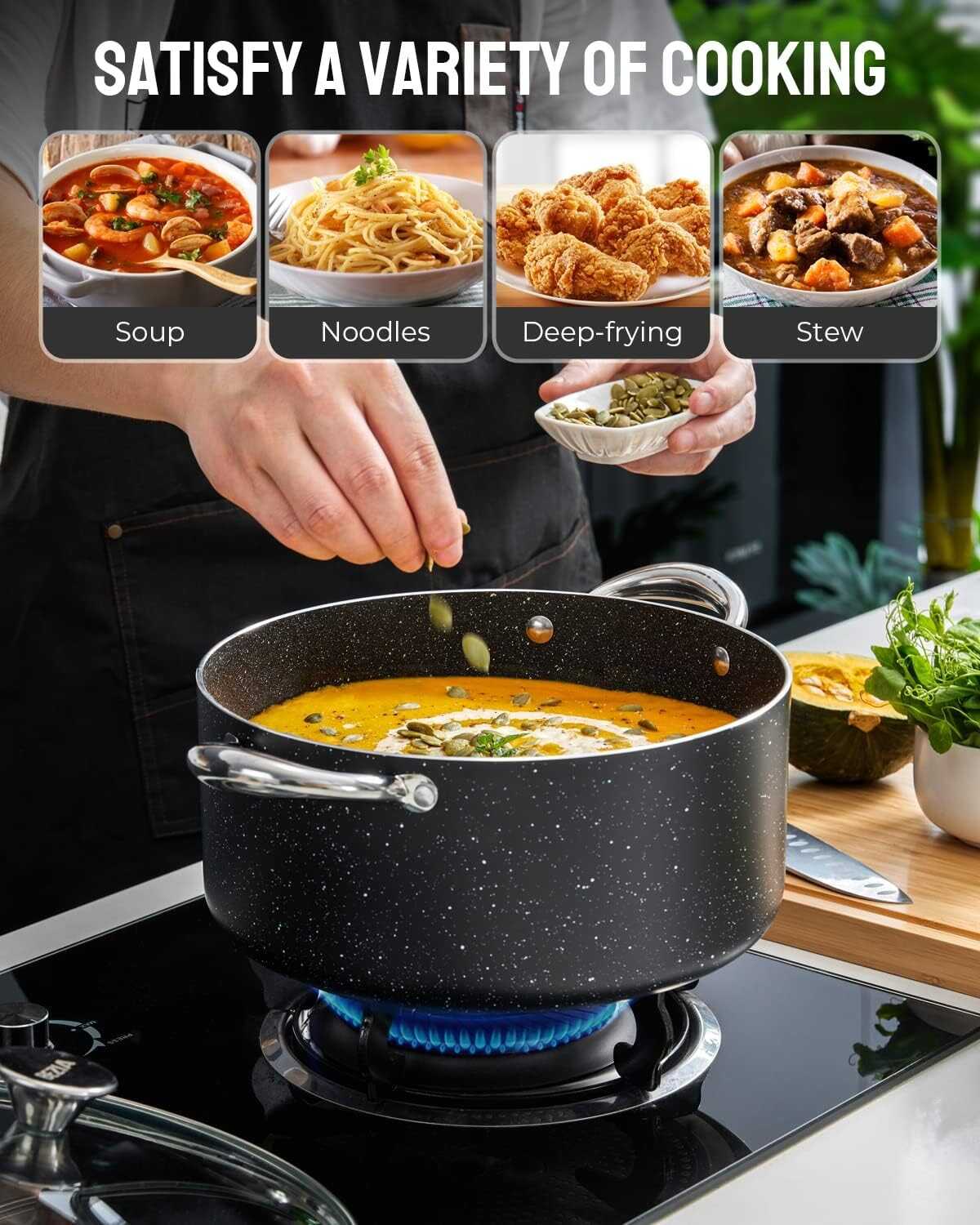 • ROUGH GRANITE NONSTICK COATING - The main reason people use excessive amounts of oil or fat in cooking is to prevent the food from sticking to the vessel and burning. Our BEZIA pot features a rough granite nonstick coating, which ensures foods and sticky sauces don’t stick to your pot while using, thereby, stirring curries and dry food in a nonstick cooking pot is easier. When you use BEZIA non-stick soup pot, you don’t need to spend time and effort scraping food off the walls of the vessels!