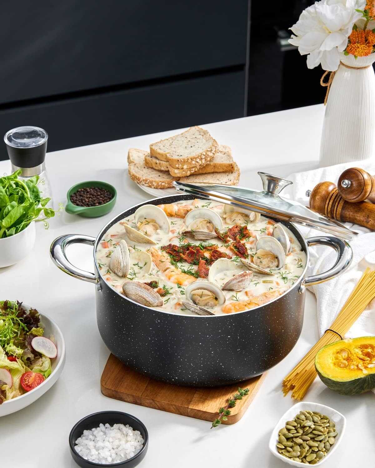 • ESSENTIAL STOCK POT - Whether you're making soup, boiling pasta, or making stock, a Stock Pot is one of the most essential cookware in your kitchen. Our BEZIA 6 QT Nonstick Cooking Pot is excellent for boiling water for paste, cooking a broth, boiling seafood, or making a hearty stew.