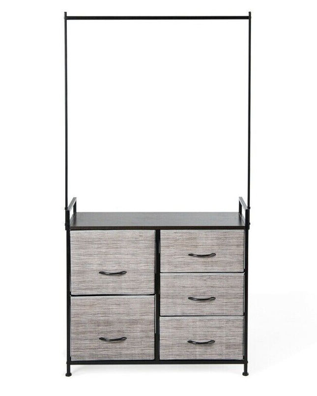 This organizer has five drawers of different sizes to help you store clothes, toys, towels, etc. The hanging rod is wide enough to hang clothes and other accessories. Made of a sturdy steel tube and high-density materials, the entire organizer is stable and features a high weight-bearing capacity.