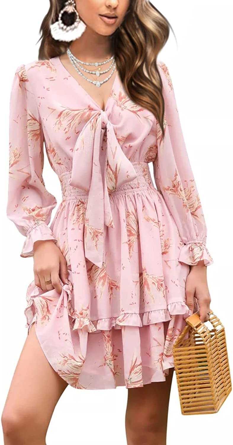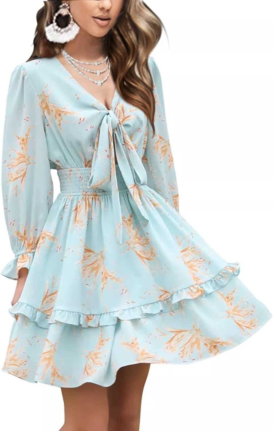EXLURA Women Tie Front Elastic Waist Tiered Ruffle Layer Floral Balloon Long Sle