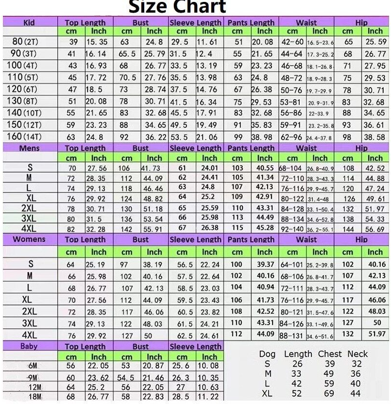 A: For example, size 6T for Kids, size M for Mother and XL For Father,