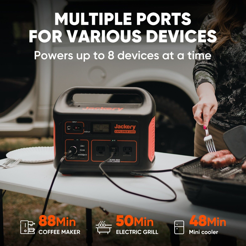 Power Pretty Much Anything: Power 90% home appliances with 1002Wh (1000W AC output power) and 8 outlets (3*AC outlet, 1*USB-A , 1*USB-A quick charge 3.0, 2*USB-C PD, 1*Car outlet). Ideal for outdoor off-grid activities and home backup power to power refrigerator, TV, mini cooler, electric grill, fan, and more for your outdoor and home needs.