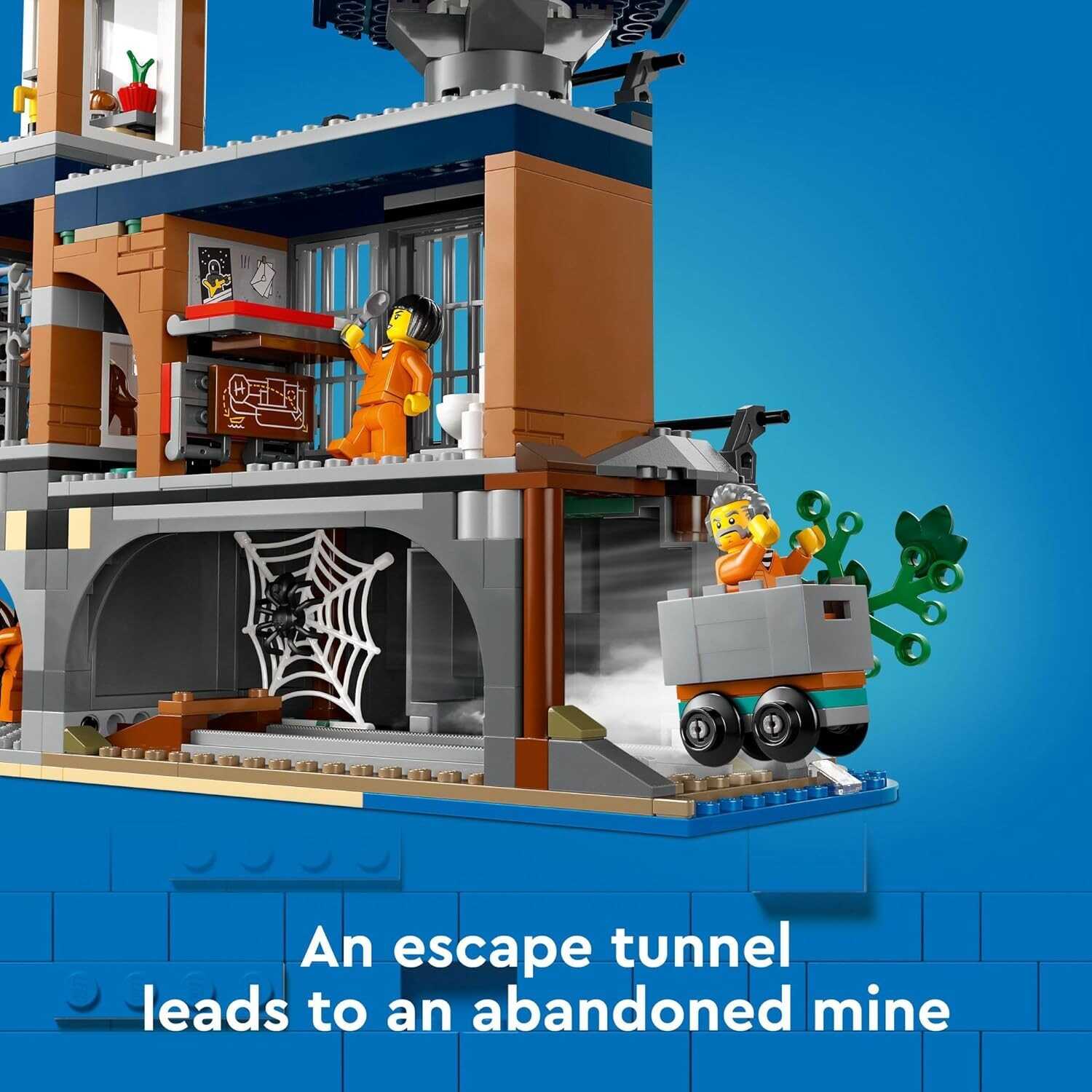This prison toy is packed with interior details for imaginative play, including a control room, an officers’ break room, entrance hall, a courtyard with a secret escape hatch, a kennel room,