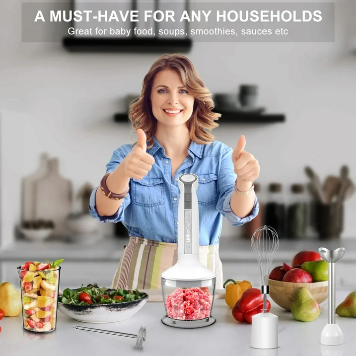 Upgraded 5-In-1 New hand blender customization and ergonomic handle including immersion blender, 500 ml chopper, 600 ml beaker, milk frother, blade shape chopper blade, and egg whisk. A variety of attachments can not only meet your needs for the variety of foods you make but also improve your cooking skills.