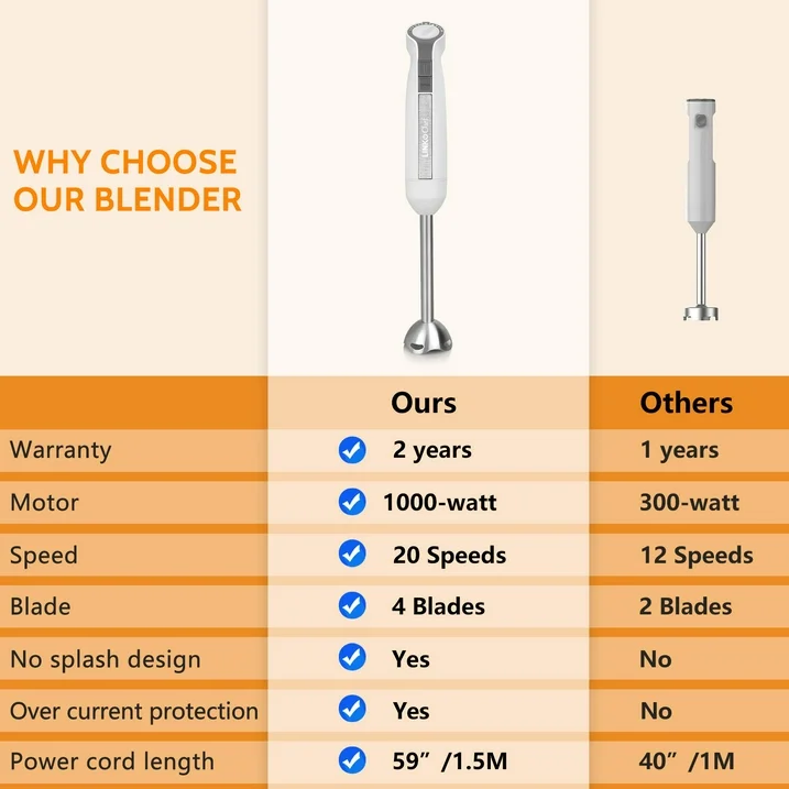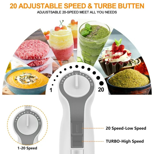 【20 Speeds Stick Blender】Find the right speed for every mixing task. Also, you can slowly increase the speed for optimal mixing consistency and avoiding clutter. For difficult mixing tasks, the TURBO button increases the mixer to its maximum speed.