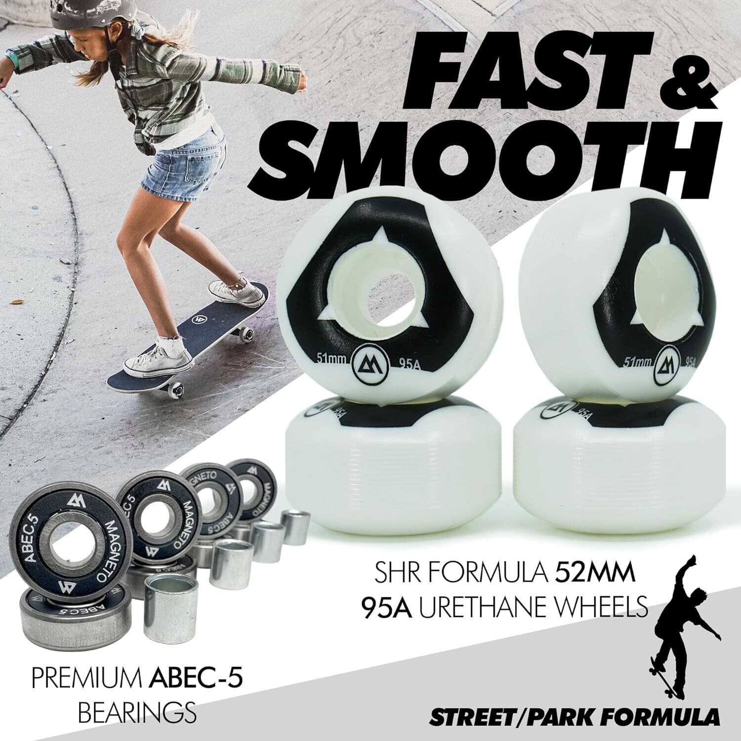 Start riding like a pro with aluminum trucks, SHR urethane wheels and long-lasting abec-5 bearings.