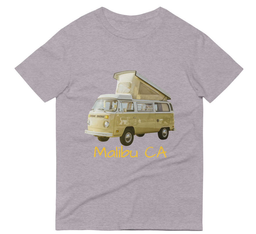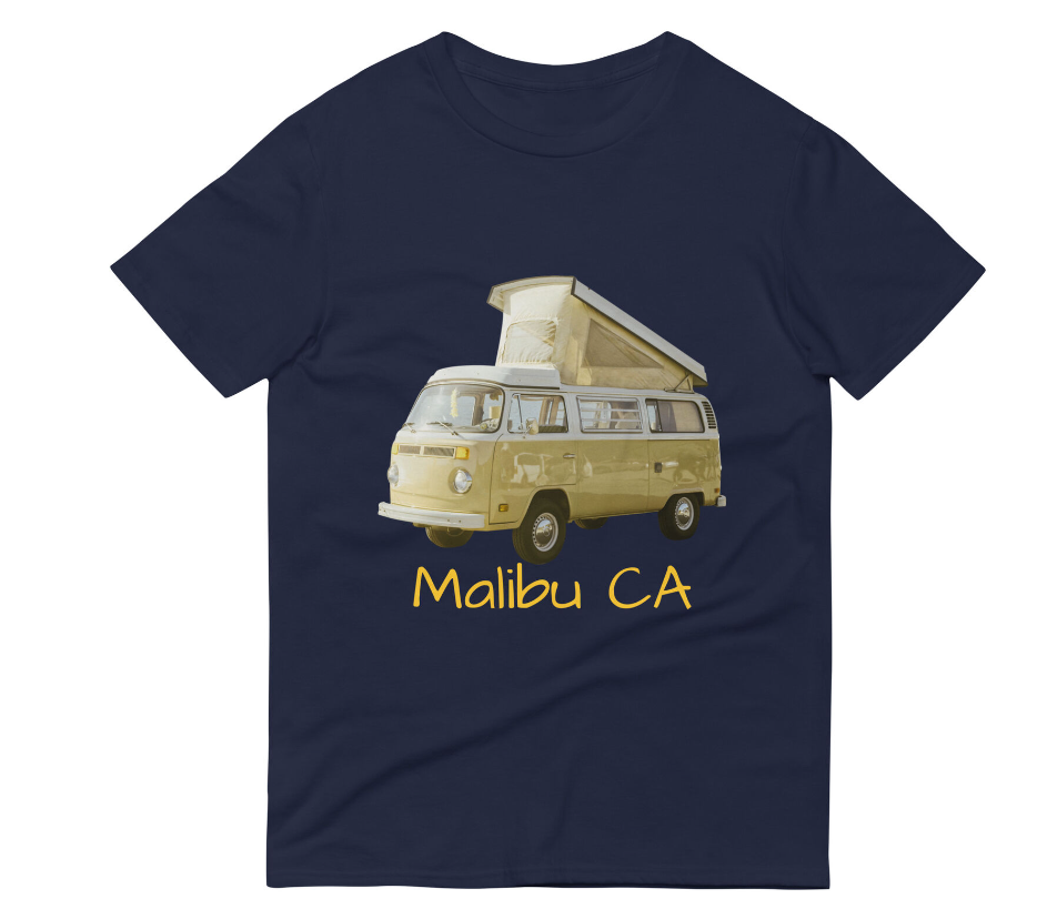 Show off your love for surfing and classic VW vans with this Malibu Pop Top T-Shirt. The black shirt features a cool graphic of a surfer and a vintage VW bus with a pop top roof. This unisex shirt is perfect for anyone who loves the beach, surfing, or retro style.