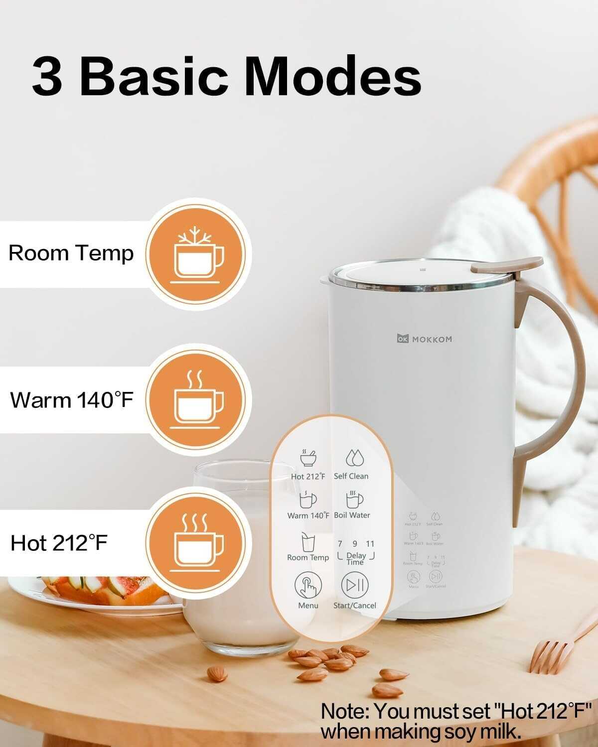 • ?【Multi-function Automatic Program】OK MOKKOM nut milk maker can skip the soaking process, easy to make various plant-based milk. The Room Temperature setting is specially used for almond milk, juicer, and other chilled nut milk; Warm (140℉) for warm beverages like oat milk; Hot (212℉) for making soy milk, rice milk, and hot chocolate. Moreover, it has Boil Water and keeps warm for 2 hours, Self-clean for a 90s rinse cycle and saves you time.