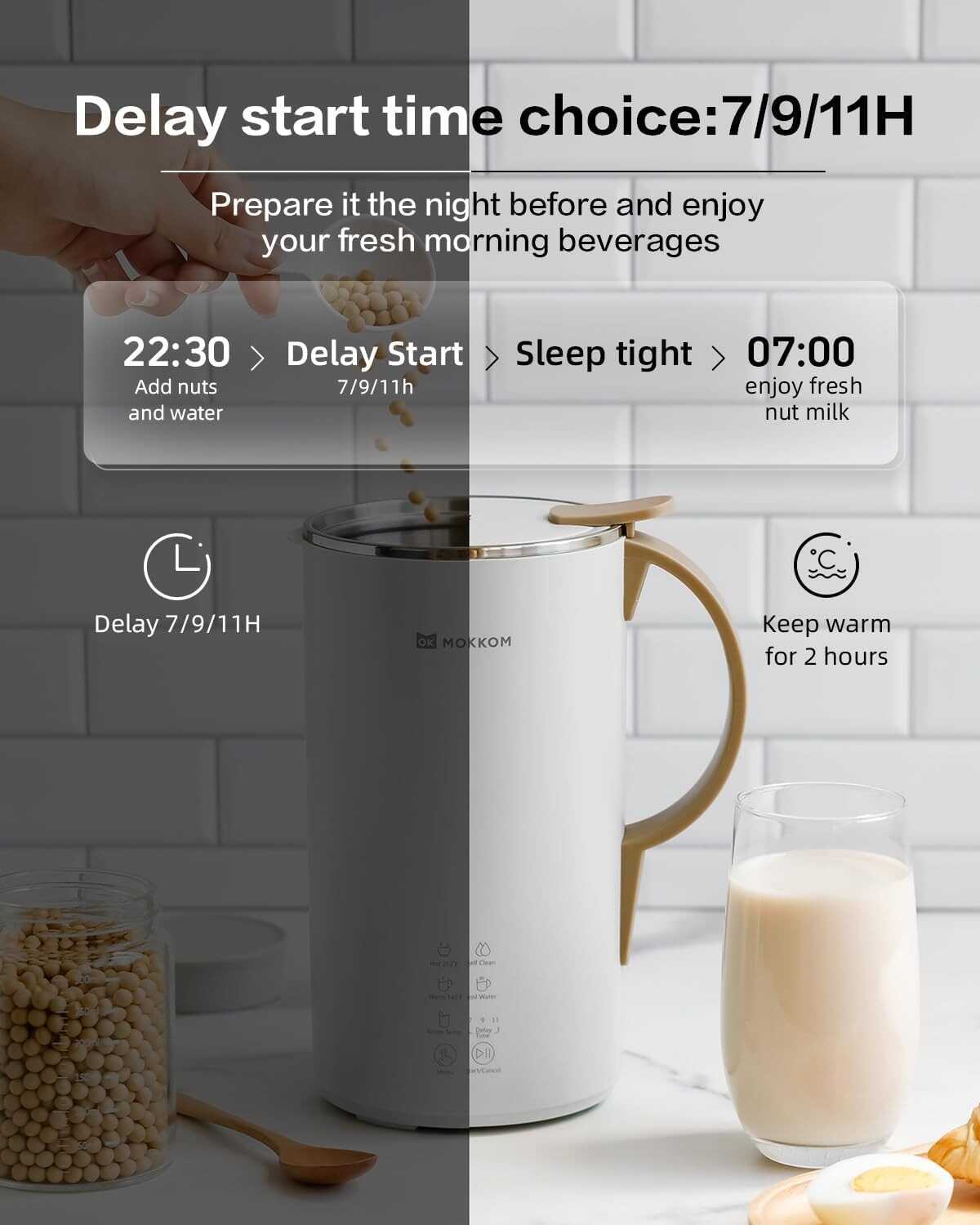 • ?【Delay Time Design】the machine is equipped with a delay function, has 7 hours, 9 hours, and 11 hours for your choice, you can preset the machine in the evening and then you can enjoy the soybean milk the next morning, convenient and time-saving for you, suitable for a busy workday.