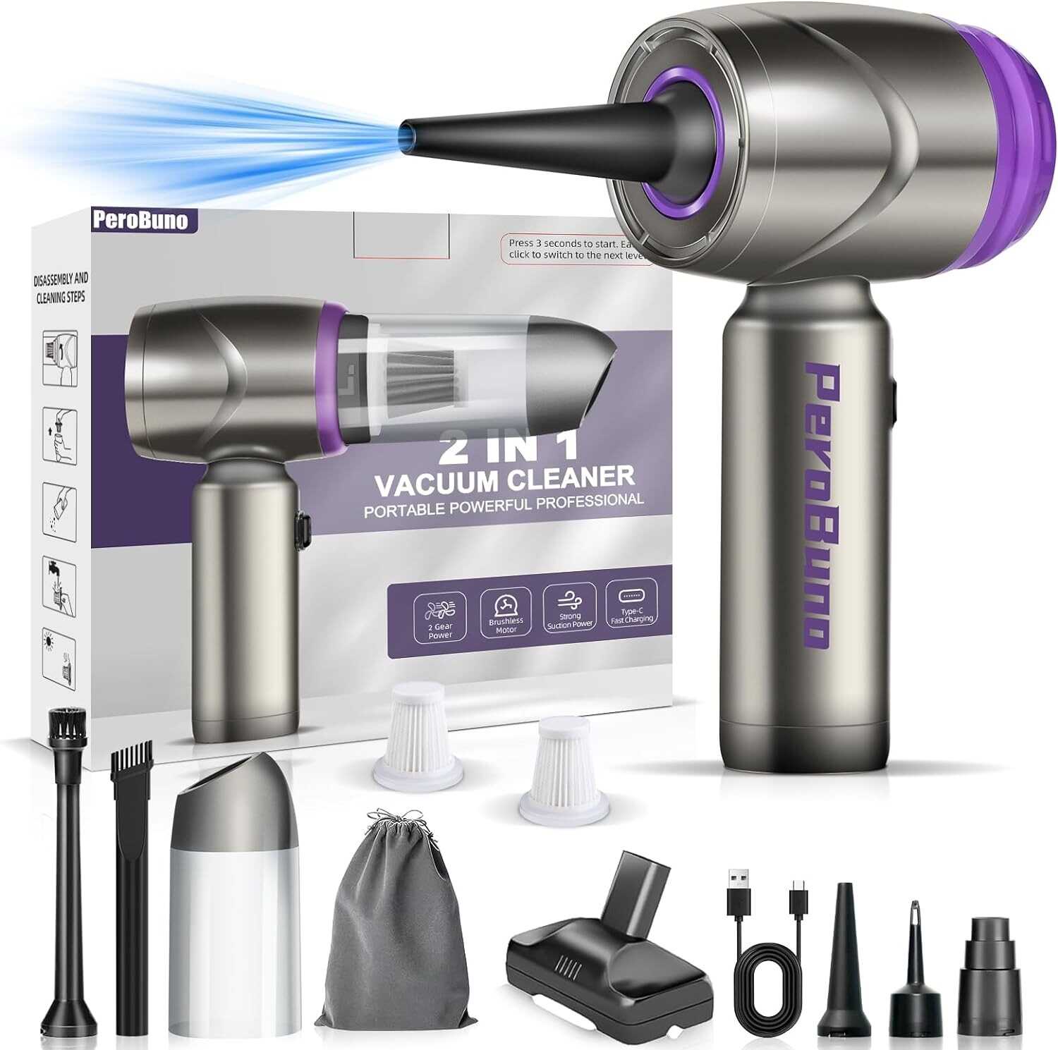 PeroBuno Air Duster for Computers, Mini Vacuum 2-in-1, 160000RPM Compressed Air, 2 Gear Brushless Motor Rechargeable Air Blower - Cordless Canned Air - Keyboard Cleaner