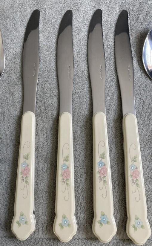 Add elegance to your dining table with this 20-piece flatware set from Pfaltzgraff. The set includes salad forks, teaspoons, dinner knives, place/oval soup spoons, and dinner forks, all made of high-quality stainless steel. The ivory-colored handles are adorned with a beautiful floral pattern, making it perfect for all occasions. This flatware set is not only durable but also reusable and BPA-free. The glossy finish adds a touch of sophistication to your table setting. The set is a perfect addition to your kitchen and a great gift for your loved ones. |