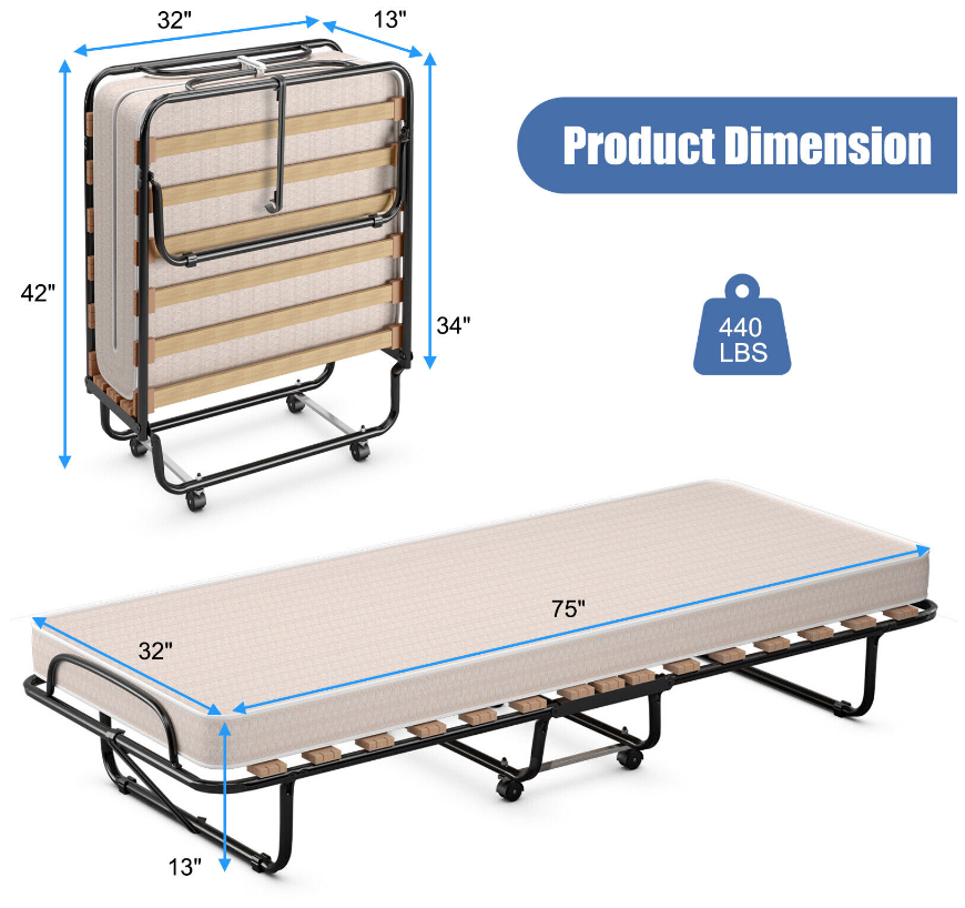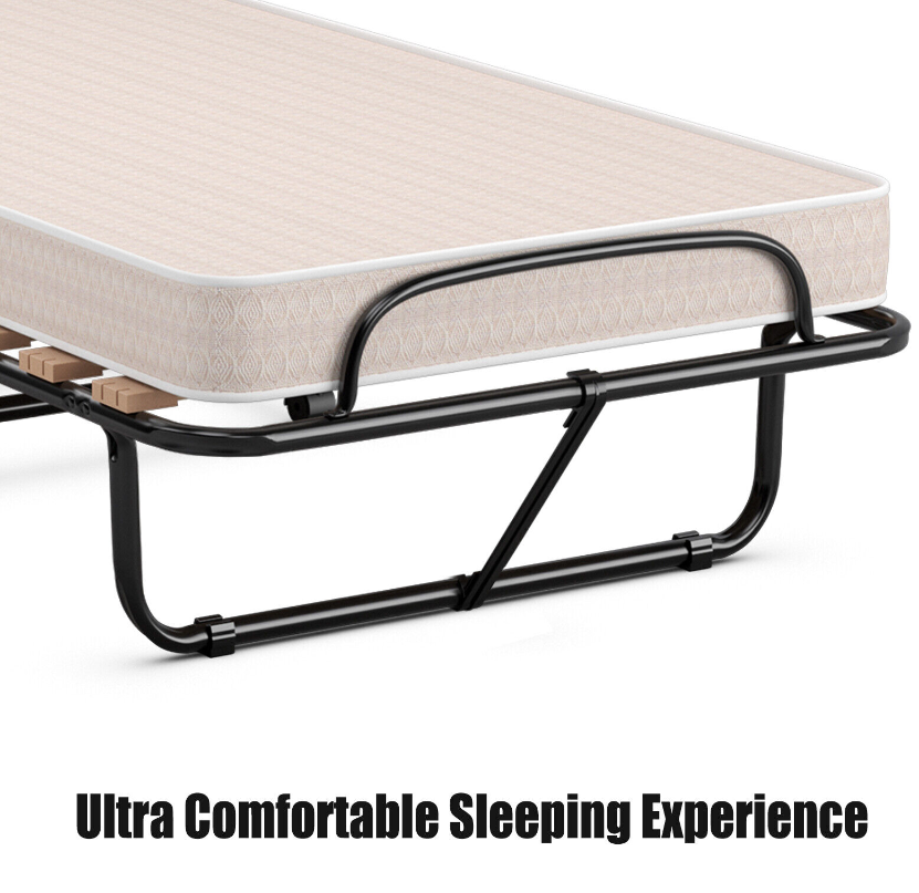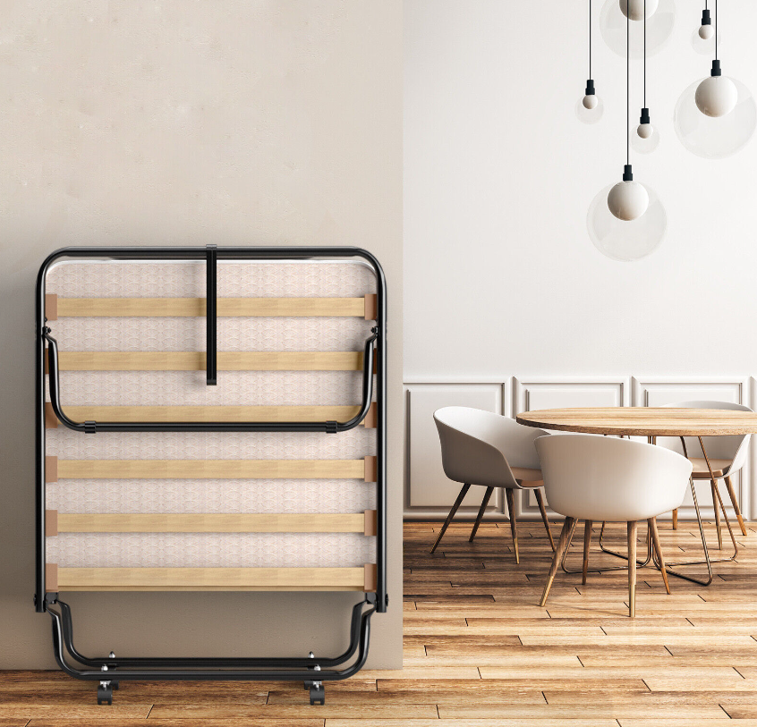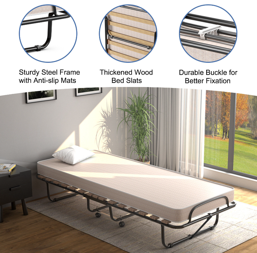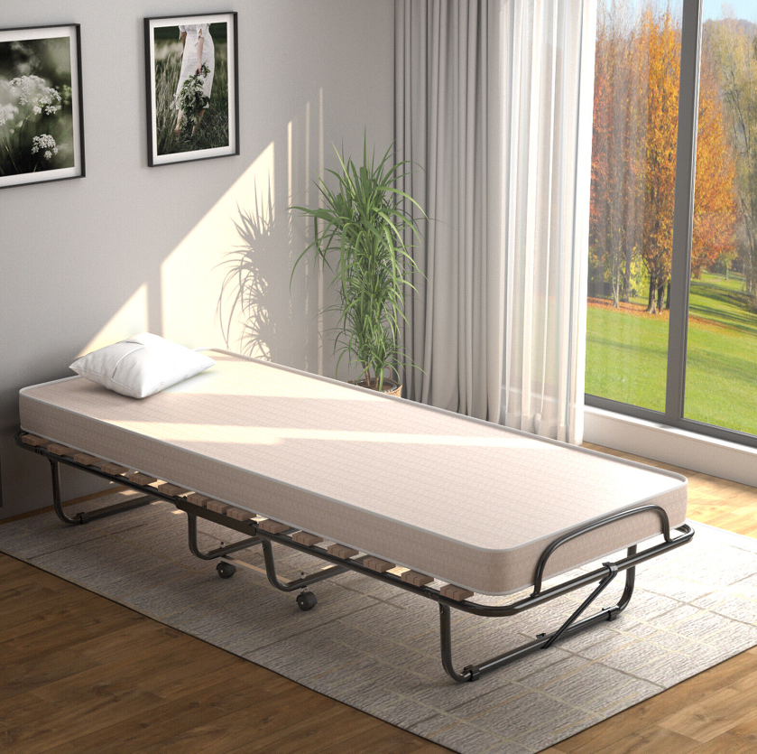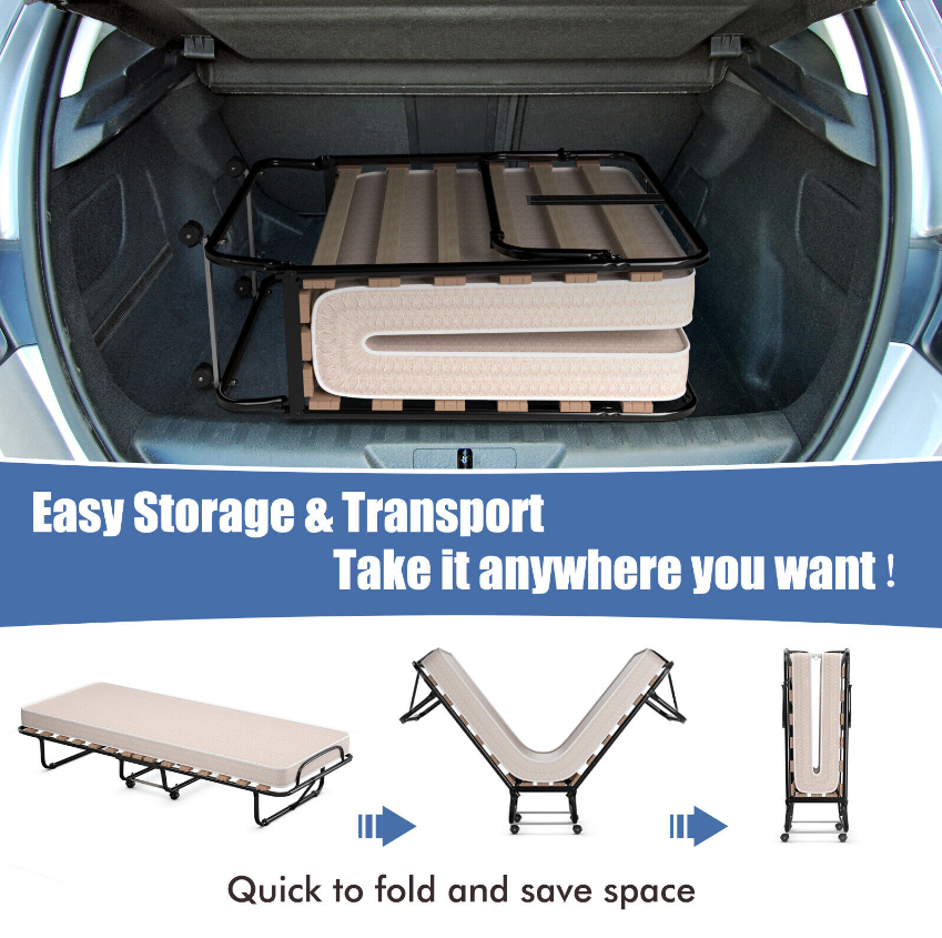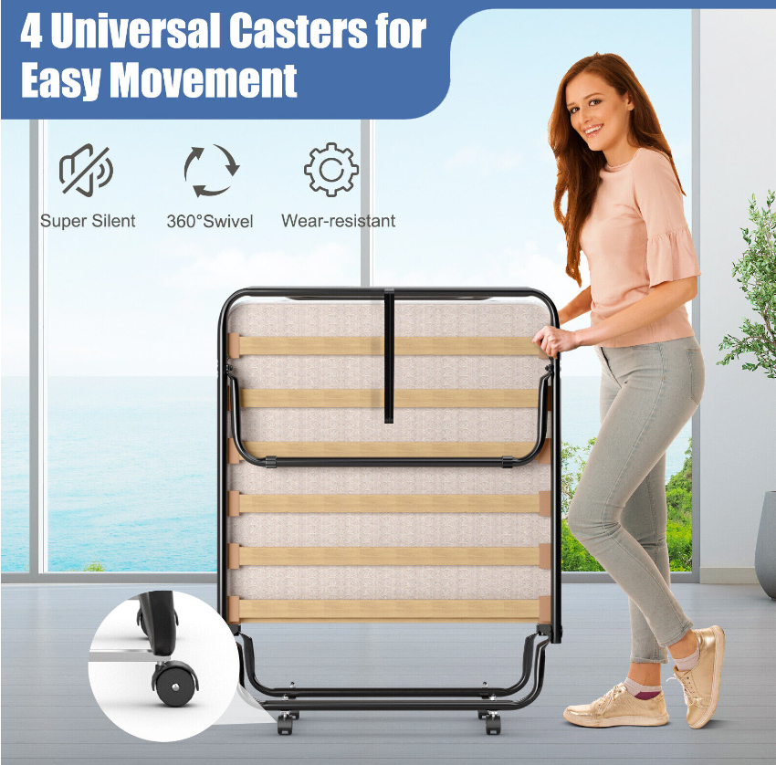 With high soft and high quality foam mattress, this folding bed gives you a cozy and comfortable feeling when you are lying. The study metal construction with dense slatted bar is strong enough to withstand maximum load-bearing capacity of 265 pounds. What's more, this bed is perfect for limited space due to its folding design. And the all-directional wheels allow you to move and store it anywhere. It can be placed in the living room, bedroom, office, study room and more places. Enjoy your leisure time with this upholstered bed!