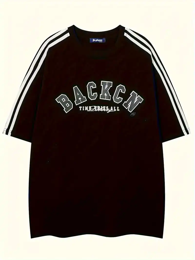 Retro Letter And Striped Men's Loose Casual Cotton Comfy Short Sleeve Crew Neck T-shirt, Summer Outdoor Sports