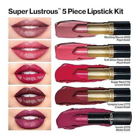 5 PIECE MULTI FINISH LIPSTICK KIT includes 460 Blushing Mauve (Plum/Berry pearl finish), 430 Soft Silver Rose (Pink pearl finish), 775 Super Red (Red/Coral cream finish), 777 Vampire Love (Plum/Berry cream finish)
