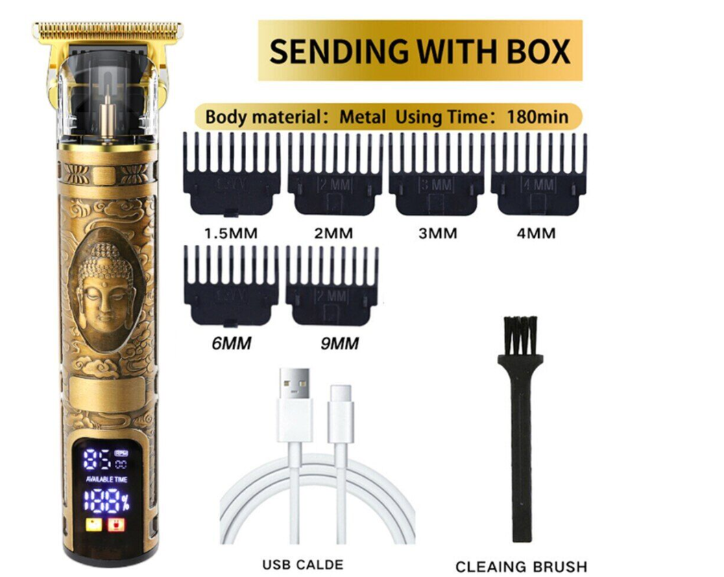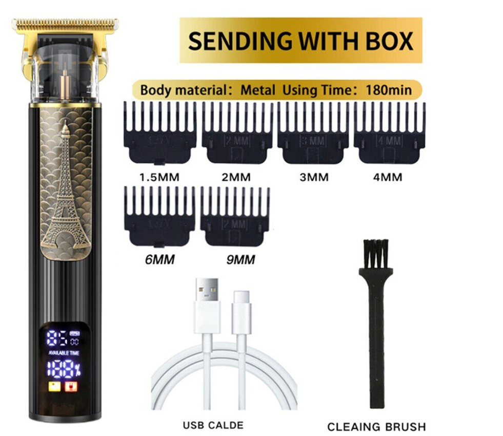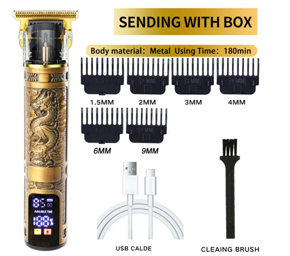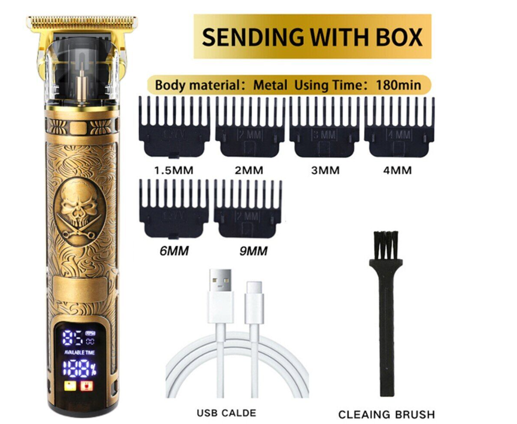 Accessories: USB charging cable, limit comb, cleaning brush, instructions.