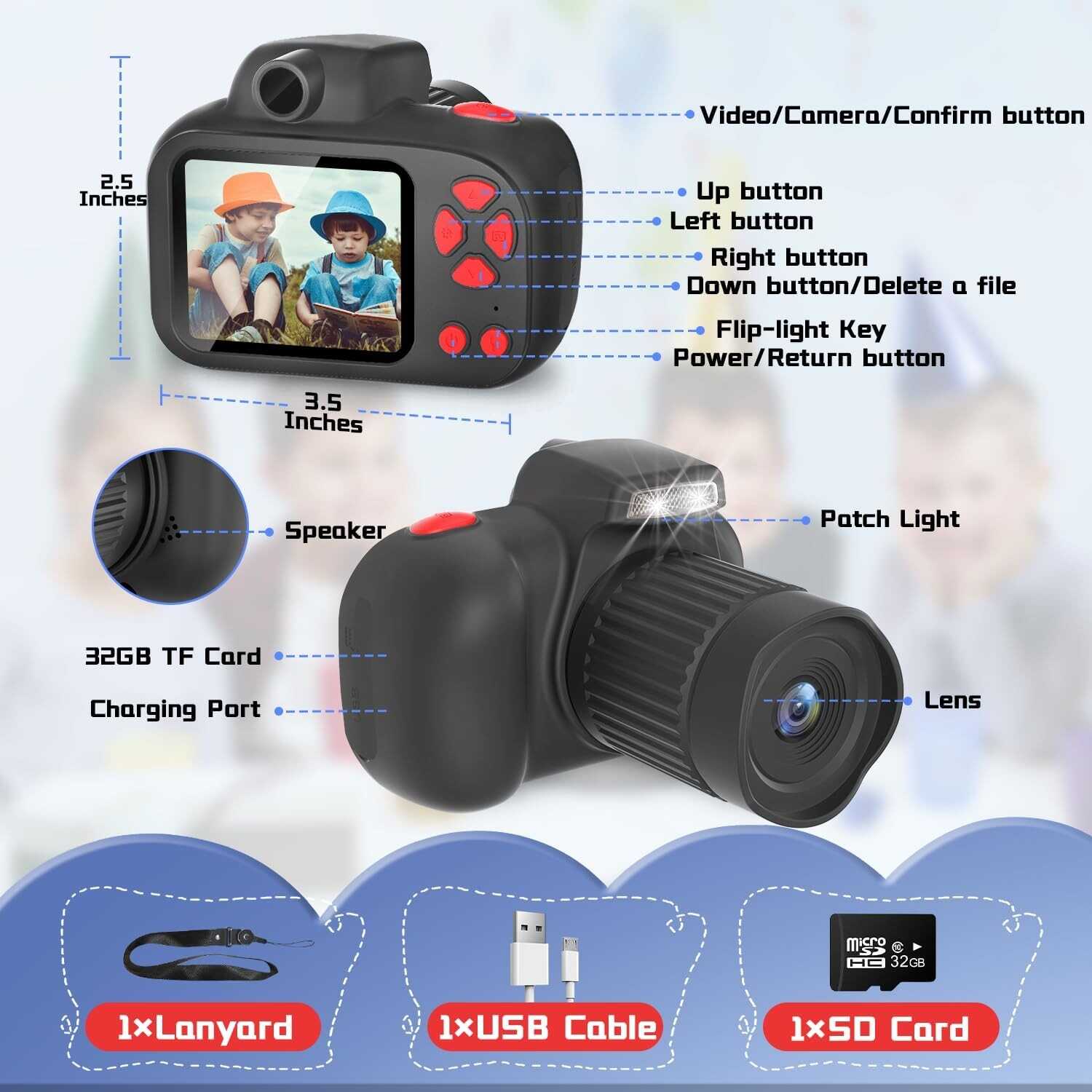 ??【Multi-Scene Selections】This Kids camera for boys girls age 3 4 5 6 7 8 9 10 11 12 year old Is Equipped With 6 Color Filter Effects and 30 Cartoon Photo Frames. With A Big Head Sticker And Cartoon Frames, Boys And Girls Can Start Capturing The World Around Them Create Interesting Life Photos And Record Memorable Moments. With A 32GB Memory TF Card, Which Makes It Possible To Store About 5000 Photos Or Hundreds Of Videos. Children Can Take Photos With Their Own Camera, Giving Them A Sense Of Accomplishment!