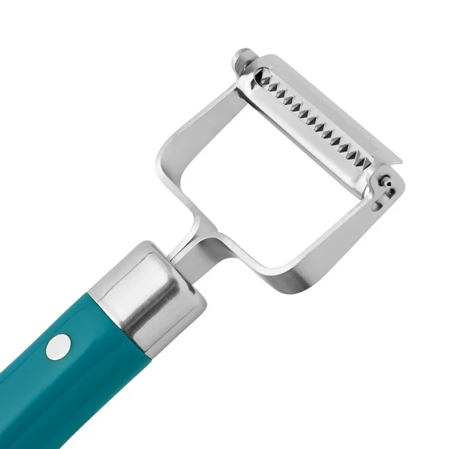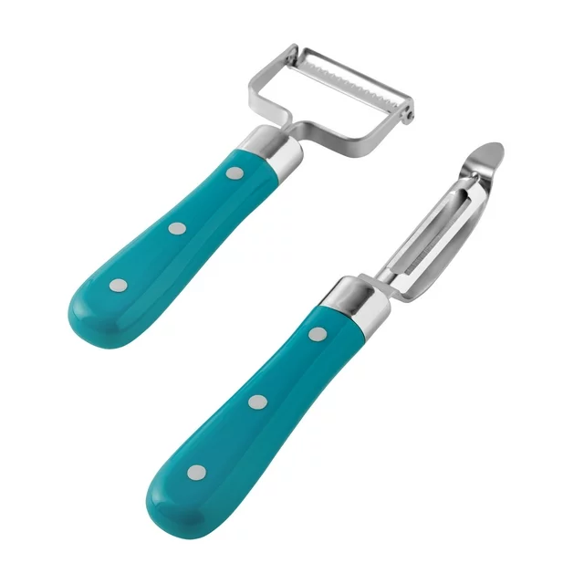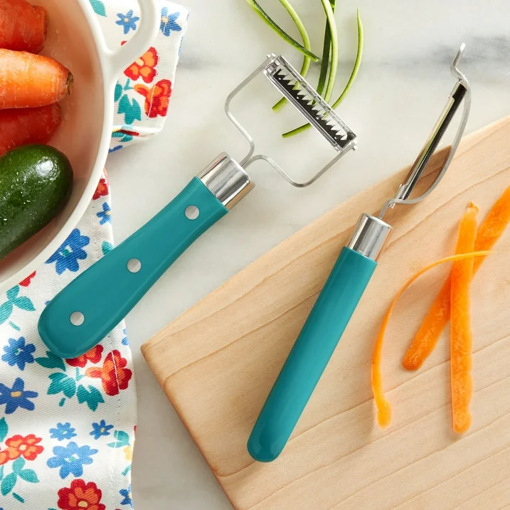 The Pioneer Woman Frontier Collection 2-Piece Vegetable Peeler Set will be your kitchen staple for everyday cooking. Functional and attractive, this peeler set includes a swivel peeler and julienne peeler so you'll always have the perfect fit for your needs. The swivel peeler is ideal for peeling potatoes, squash, apples, mangos, cucumbers, and other tough-skinned produce, and it features a sharp tip that helps you remove potato eyes and small blemishes or bruises while peeling. The julienne peeler slices almost all fruits and vegetables, even hard to hold and waxy-skinned fruits such as oranges, lemons, and limes, cutting them into thin, elegant strips. Both peelers have contoured riveted handles that provide a secure and comfortable hold. Constructed with durable stainless steel, these veggie peelers offer years of quality use. Meet Ree: Ree Drummond is a NY Times Best Selling Author, TV personality, social media phenom, and the woman behind the popular Pioneer Woman lifestyle blog that started it all. She's also a lover of butter, basset hounds, Ethel Merman, her hunky, cowboy husband Ladd, and their four kids. Her casual country style and delicious recipes have made her a go-to for all things cooking and entertaining.