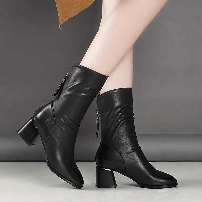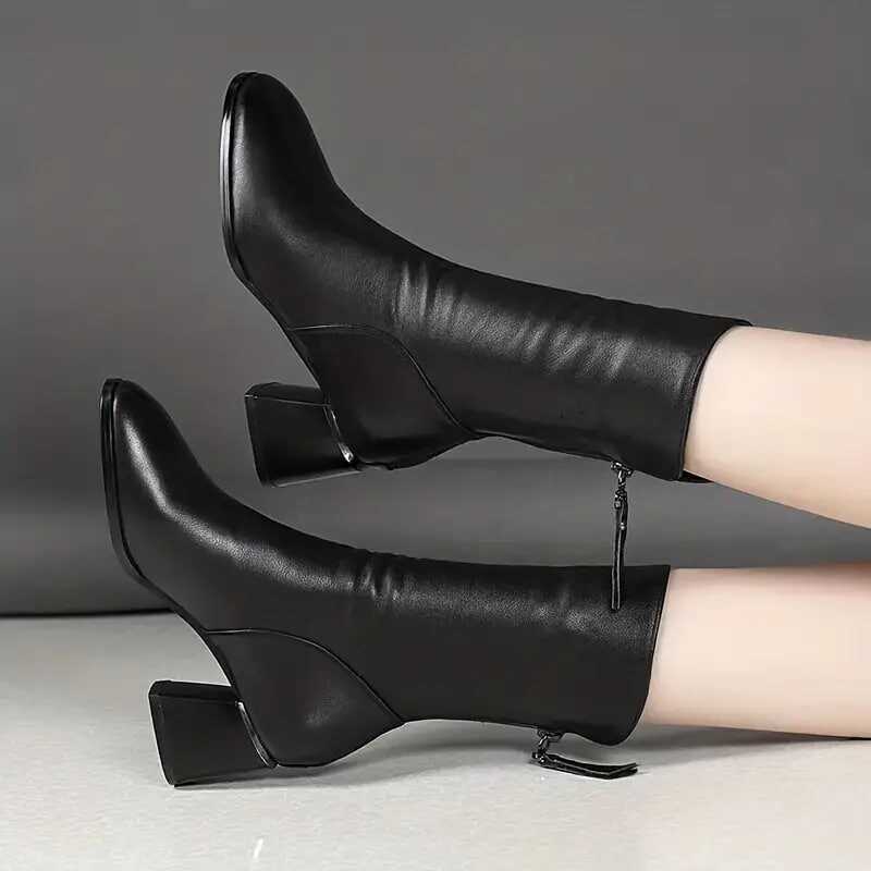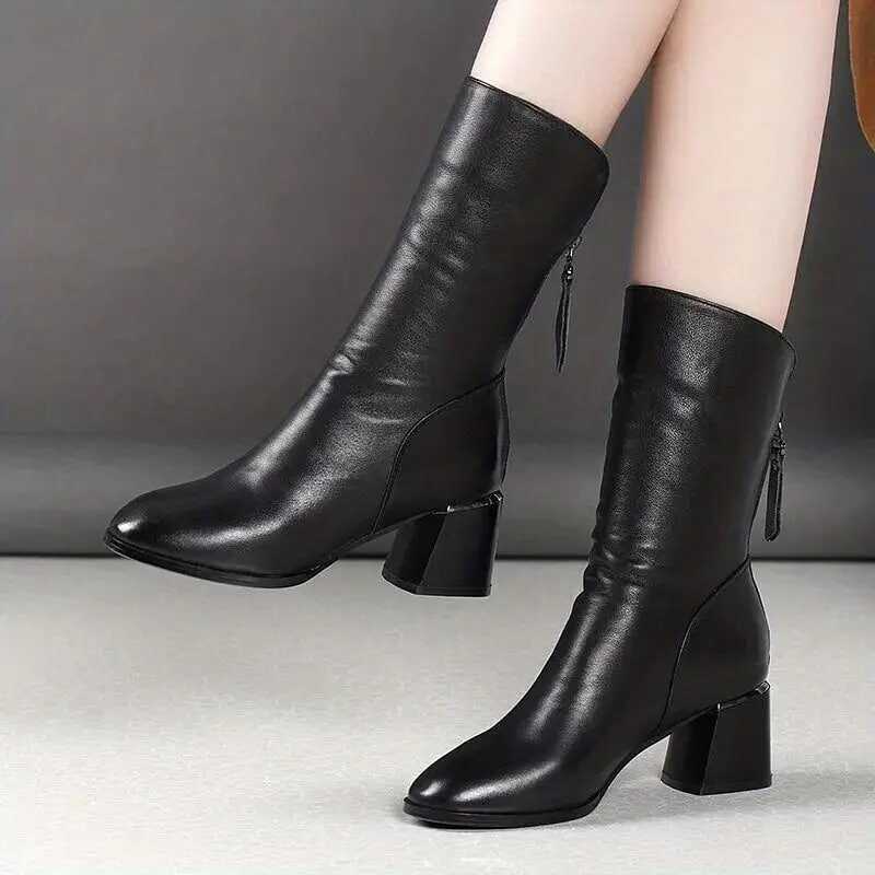 Women's Solid Color Boots, Back Zipper Chunky Heel Casual Soft Sole Boots, Mid Calf Versatile Winter Shoes