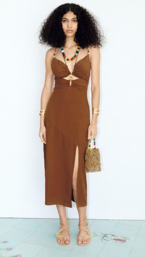 Zara Brown Rustic Beaded Midi Dress Size Small S Strappy Linen Blend Cut Out